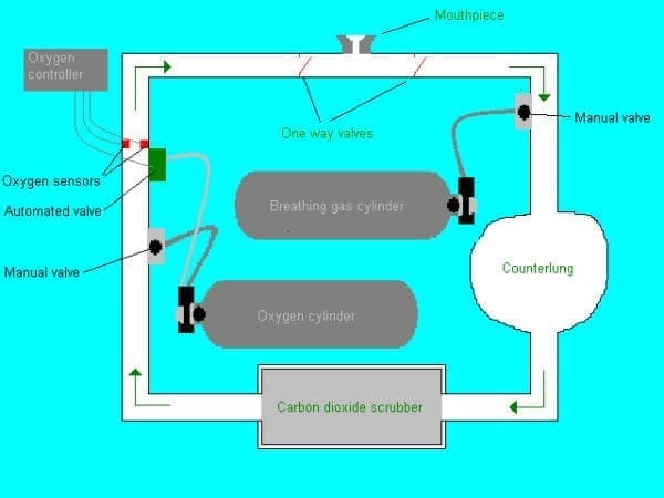 Closed-circuit: The inhaled breath comes from a bag/counter-lung, and when exhaled, is then cycled through a system that removes waste carbon dioxide and replaces the consumed oxygen, then returned to the bag. There are no bubbles.