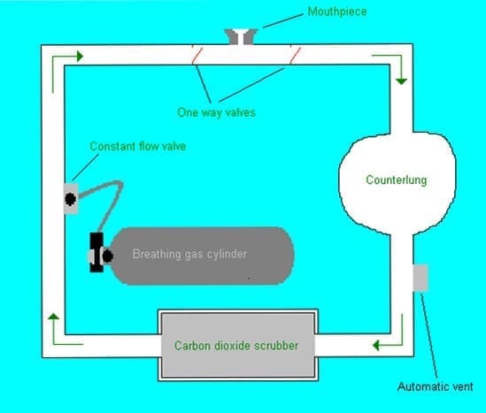 Semi-closed circuit: The diver inhales from a bag or counter-lung, and the exhaled breath cycles through a system that removes waste carbon dioxide and returns it to the counter-lung. It replaces consumed oxygen by employing a slow, steady flow of gas into the counterlung resulting in a slow, small stream of bubbles.
