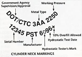 Hydrostatic Test Date: A cylinders initial hydrostatic test date will usually appear as the last or only item in the last row of information originally stamped on the cylinder. Subsequent test dates may appear anywhere on the cylinder’s neck. The test date numbers represent the month and year in which the cylinder was tested and these numbers are separated by the hydrostatic tester’s initials or a special registered symbol.